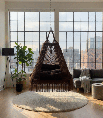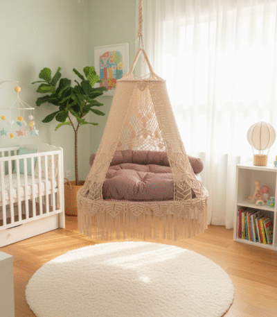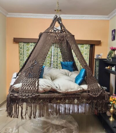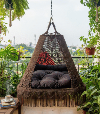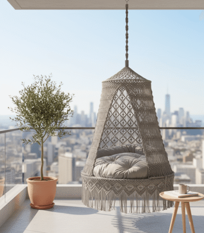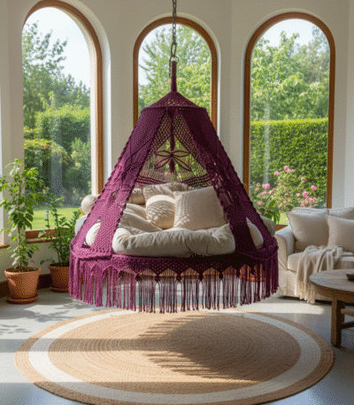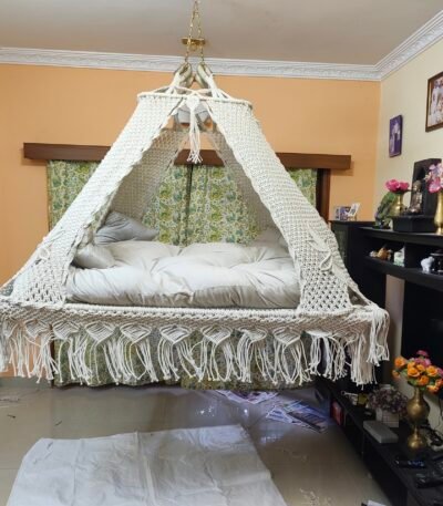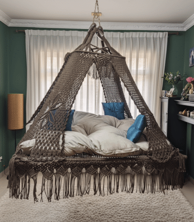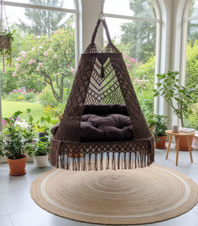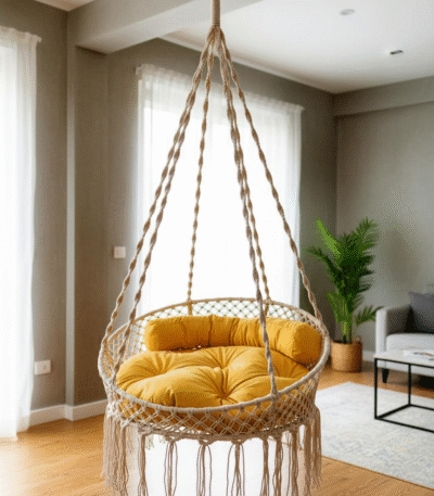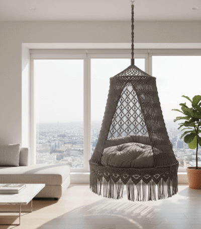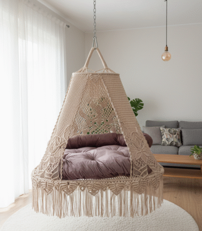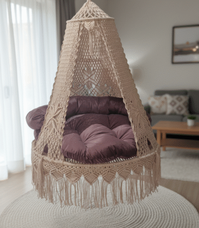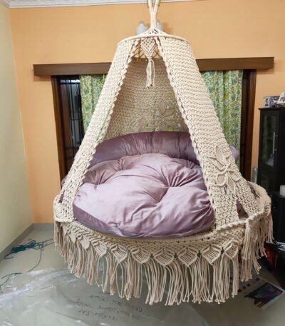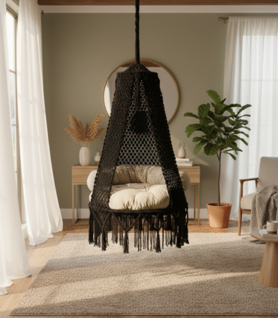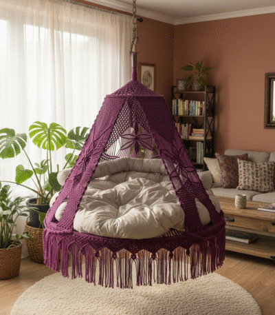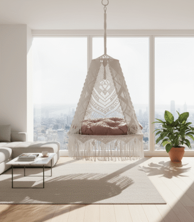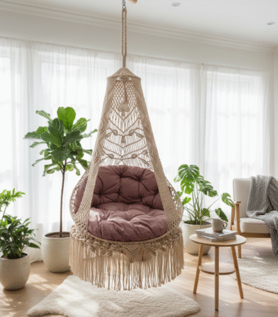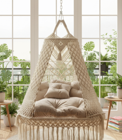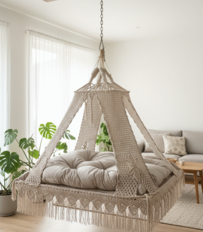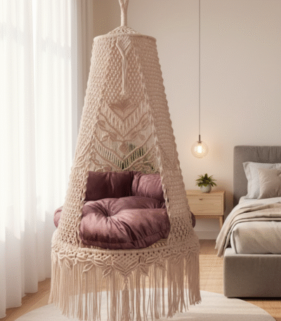 A macrame swing is a handcrafted hanging chair made using strong cotton cords knotted in unique boho patterns. It adds both comfort and style to indoor and outdoor spaces.