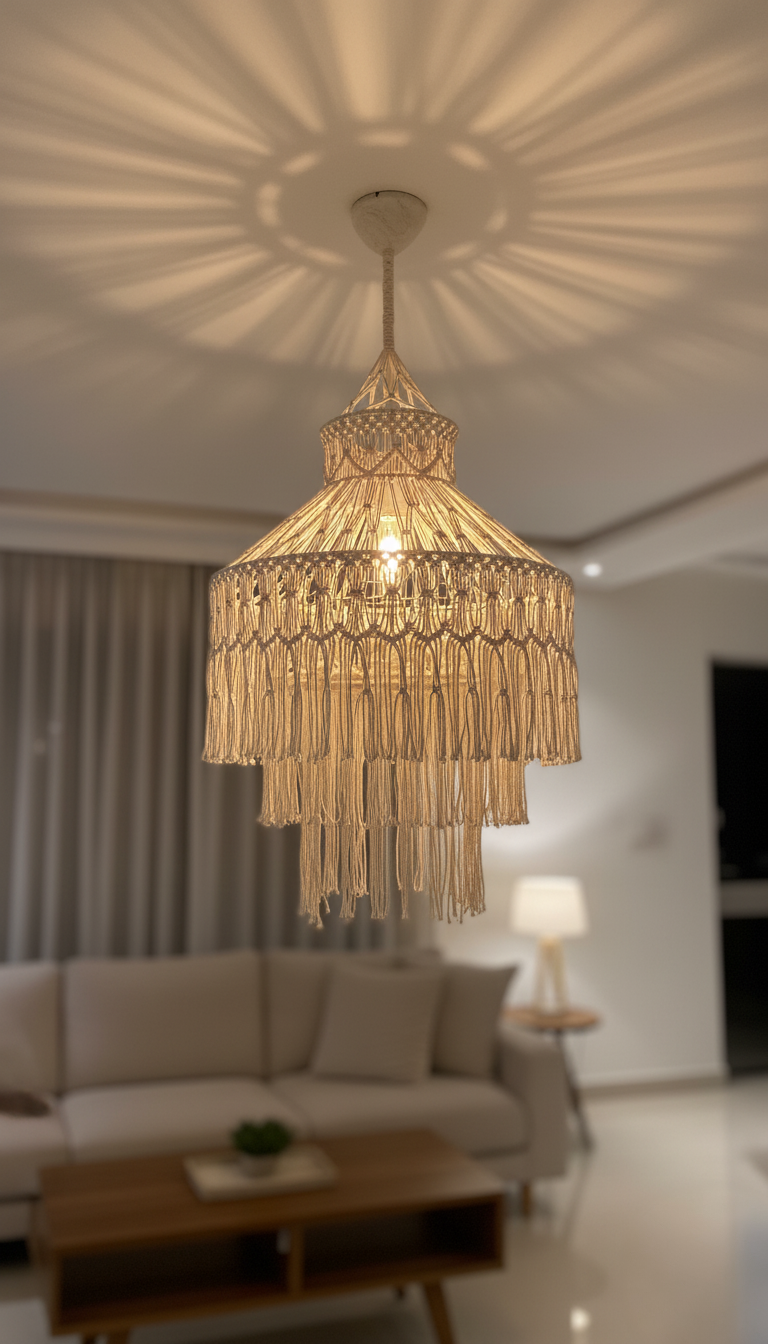 Bring warmth and texture to your space with the 24” Macramé Chandelier, beautifully handcrafted using premium cotton cords. Compact yet eye-catching, this chandelier is perfect for bedrooms, dining areas, cozy cafés, and boho-inspired interiors. It creates a soft, inviting glow while adding a timeless handcrafted touch to your décor.