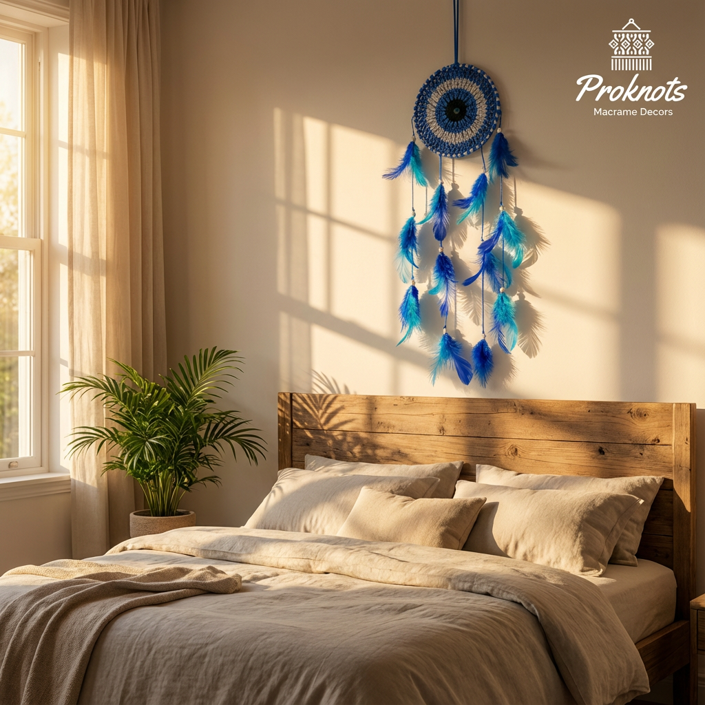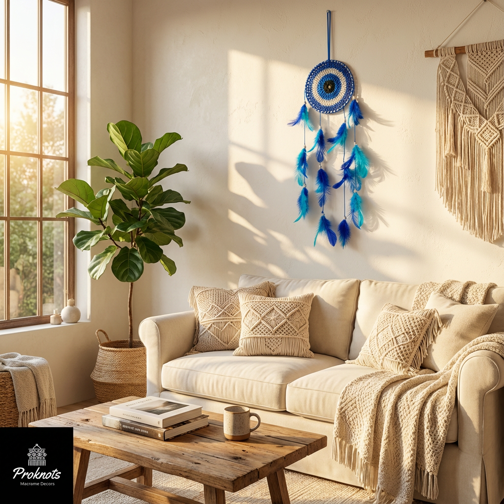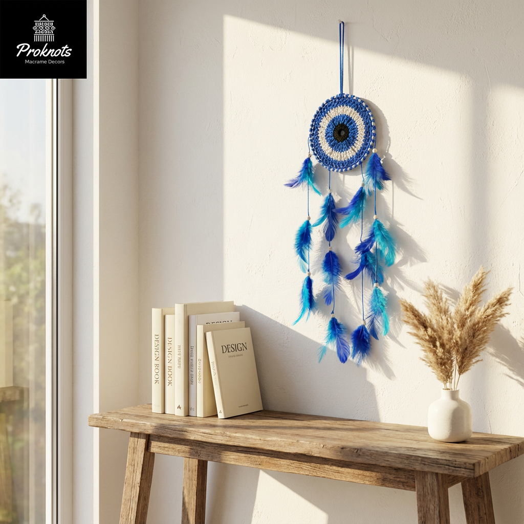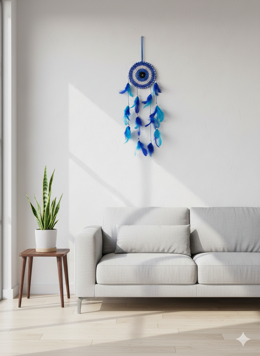 Invite calm and positive energy into your space with the Blue Aura Dreamcatcher, thoughtfully handcrafted to blend beauty with meaning. Featuring a detailed crochet evil eye motif at the center, this 10-inch dreamcatcher is designed to symbolise protection while adding a soothing boho touch to your décor. Soft blue and white feathers flow gently below the frame, enhancing its airy, peaceful appeal. Hand-finished with care, this piece is perfect for bedrooms, nurseries, meditation corners, or as a meaningful gift for loved ones. Product Details: Diameter: 10 inches Design: Crochet Evil Eye Color: Blue & Ivory Finish: Feathers Material: Cotton thread, natural ring, feathers Handmade with care Ideal For: Bedroom décor, vastu-friendly spaces, baby rooms, housewarming gifts, and protective wall décor.
