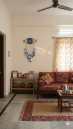 The Blue Sentinel Evil Eye Dreamcatcher is designed as a quiet guardian for your space. Handcrafted with a detailed crochet evil eye centerpiece, it symbolises protection, awareness, and calm energy while adding a refined boho accent to your décor. Accented with soothing blue tones and soft feather detailing, this dreamcatcher brings balance and visual harmony to bedrooms, living spaces, nurseries, or meditation corners. Each piece is carefully handmade, making it both meaningful and decorative. Product Details: Design: Crochet Evil Eye Color: Blue & Ivory Finish: Feathers Material: Cotton thread, natural ring, feathers Handmade artisanal décor Ideal For: Protective wall décor, vastu-friendly interiors, bedrooms, kids’ rooms, and thoughtful gifting.