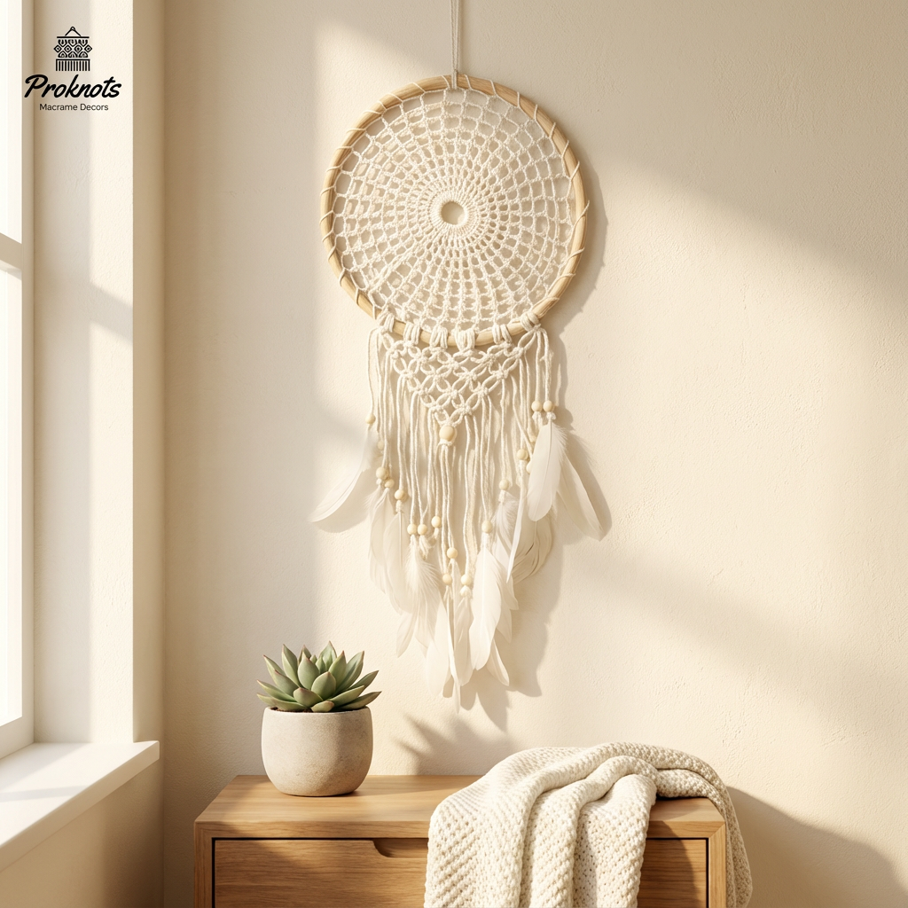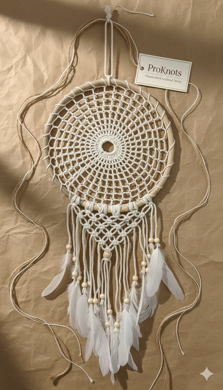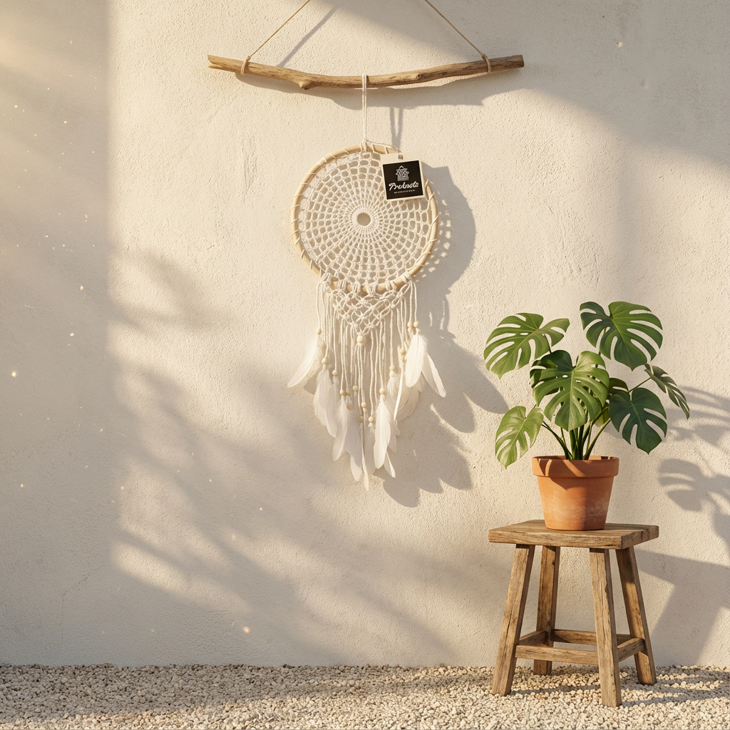 Bring home an effortless boho charm with this Boho Beaded Crochet Dreamcatcher, thoughtfully handcrafted using natural textures and timeless design. Set on a wooden hoop, the intricate crochet pattern forms a delicate centerpiece, finished with hanging wooden beads and soft feathers in soothing natural tones. Its neutral colour palette blends beautifully with modern, bohemian, and earthy interiors, making it a versatile décor accent for bedrooms, living spaces, nurseries, or calm corners of your home. Each piece is handmade with care, celebrating slow craft and simple elegance. Product Details: Diameter: 10 inches Hoop: Natural Wooden Hoop Design: Hand-crocheted web Finish: Hanging beads & feathers Color: Natural / Ivory Material: Cotton thread, wood, beads, feathers Handmade artisanal décor Ideal For: Boho-inspired homes, bedroom wall décor, nursery décor, housewarming gifts, and peaceful living spaces.